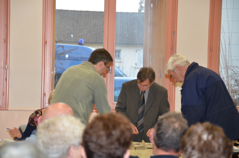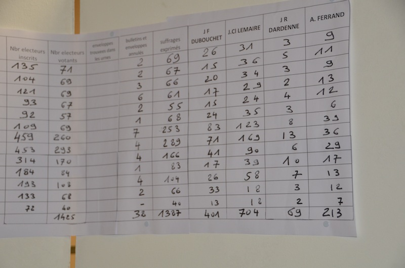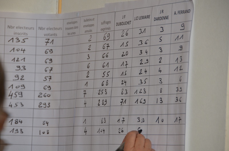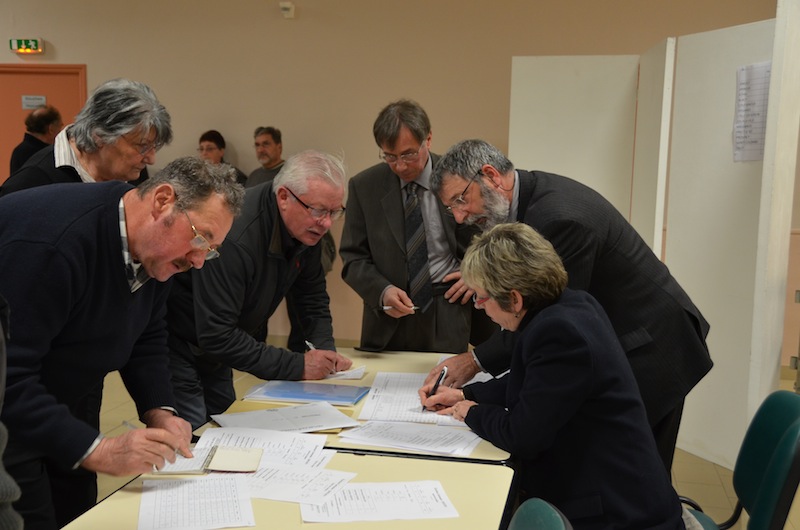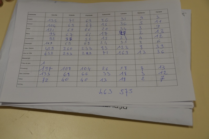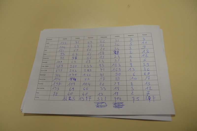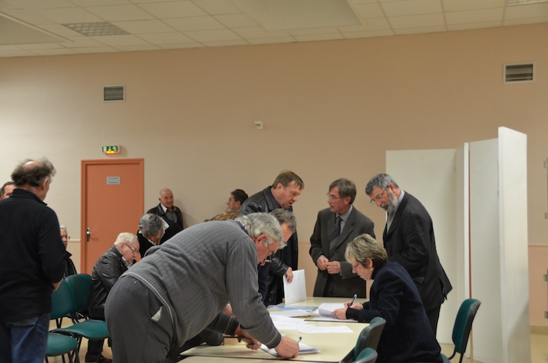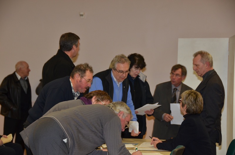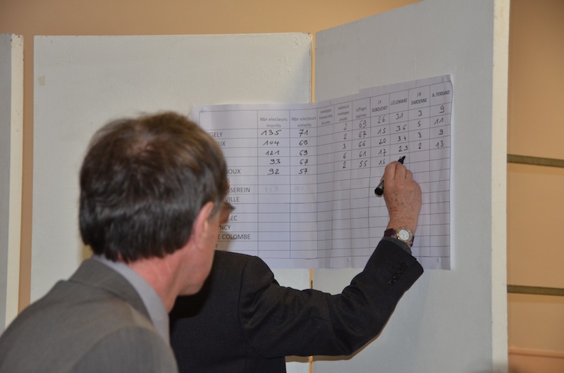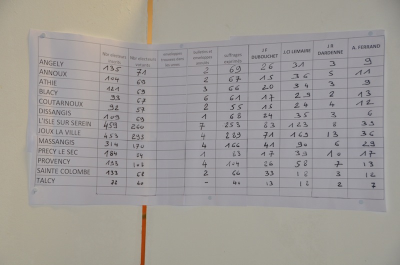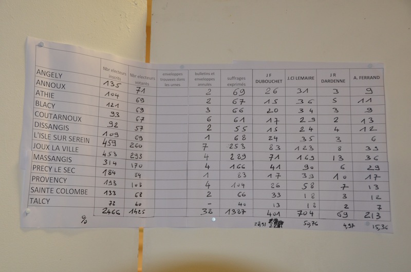 info du jour : Après trois semaines pour les uns et les autres de réunions publiques d’information dans le cadre des dernières élections cantonales sous sa forme actuelle. (La réforme des collectivités locales prévoit en effet la suppression du Conseil Général et du Conseil Régional en le remplaçant par une seule entité qui portera le nom de Conseil Territorial). C’est aujourd’hui le jour du 1er tour des élections. Ouverture des bureaux de vote à 8h. Commentaires d’électeurs,« cette journée de vote s’est passée dans le calme d’un flux constant tout au long de la journée ». 18h, clôture des bureaux de votes. Aussitôt le dépouillement des bulletins commence et une demie heure plus tard, le maire du village est en mesure de nous communiquer les résultats. Ainsi les quatre candidats inscrits obtiennent respectivement sur la commune de l’Isle sur Serein, les scores suivants ; JF Dubouchet (PS) 83 voies, JC Lemaire (DVD) 123 voies, JR Dardenne 8 voies et A Ferrant (FN) 39 voies. La commune de l’Isle sur Serein étant le chef lieu de canton, elle a le privilège d’être de base de recueil des résultats des communes voisines. C’est ainsi que nous voyons les douze maires des commune voisines, arriver et remettre au comité de recueil des résultats, enveloppes et feuilles de résultats de leurs communes respectives (le canton de l’Isle sur Serein comptant 13 communes). 19h 45, après vérification et comptages, le résultat final tombe. C’est ainsi que nous apprenons par le maire de l’Isle sur Serein, Alain Chaplot, la réélection du candidat sortant, JC Lemaire, avec 50, 79 % des suffrages exprimés. Ce dernier présent dans la salle est monté sur le podium pour remercier les électeurs qui lui ont fait confiance pour ce dernier mandat des élections cantonales. Quelques mots envers le candidat JF Dubouchet pour sa campagne menée dans la digité. Ce dernier a également adressé ses remerciements aux maires des communes visitées, aux public qui a assisté aux réunions et aux électeurs qui lui ont fait confiance par la voie des urnes. La soirée se terminera par un verre de l’amitié, charcuteries et pâtisseries offert par l’élu. En photo, le déroulement de la soirée
