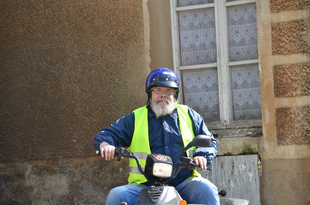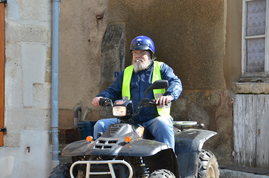 L’Isle le 20 avril: Cette silhouette de motard en train de se garer en face de chez moi, il me semblai bien l’avoir déjà vu, et pas plus tard que dimanche, lors de la manifestation cycliste. Chose étrange (ou prémonitoire) c’est à proximité de la ligne d’arrivée qu’est apparu cette silhouette, un « petit pépère » (1m90 au moins), sur son quad roulant tranquille. Quelle surprise, et quel plaisir, de voir aujourd’hui « Le Grand Francis ». Avec un peu de recul , il me plait à penser que de le voir passer cette ligne d’arrivée, représente une victoire sur 7 longues années de souffrances qui ont suivi son opération. Grâce à un ami de 20ans il a eu accès au seul véhicule qui à son sens répond à ses besoins de bouger et ainsi de repousser ses limites d’autonomie . Son plus grand problème, à ce jour, étant la station debout (un quart d’heure maxi) et l’équilibre qui y correspond. Le quad lui permet de répondre à cette perte d’équilibre qu’ il sent venir fort heureusement. Accompagner de son fils, il peut réaliser des grandes promenades, nécessaires pour son esprit. C’est un Francis dynamique avec qui j’ai eu plaisir de passer un instant, comme le prouvent les photos qui suivent, que je démarre ma journée. Merci Francis pour cette leçon de vie et de persévérance.