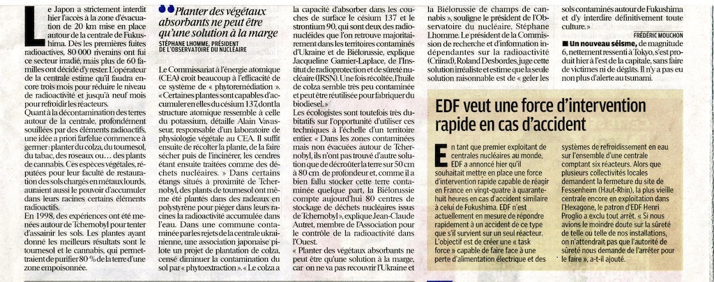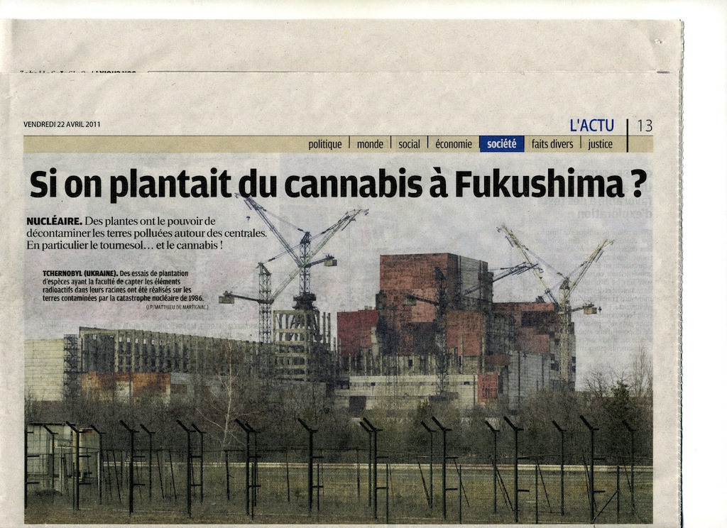l’Isle le 22 avril: À lire aujourd’hui dans le quotidien « le parisien », une information sur le pouvoir de décontamination de certaines plantes ( colza, cannabis notamment) que pourraient utiliser les pays touchés par les catastrophes nucléaires. Affaire à suivre…..
