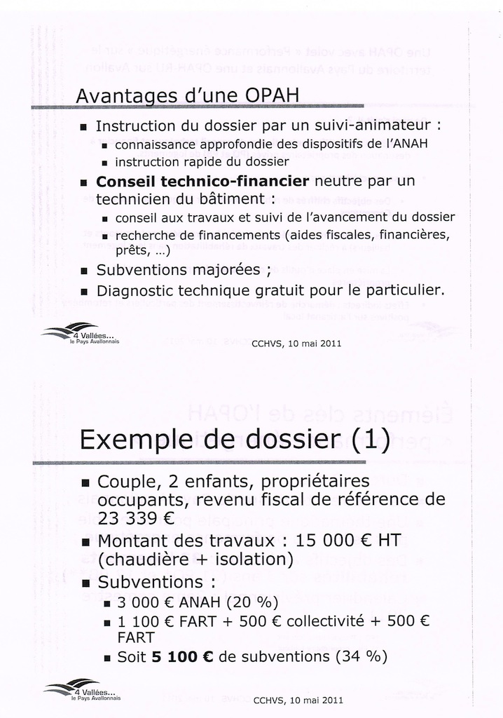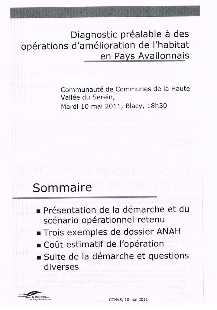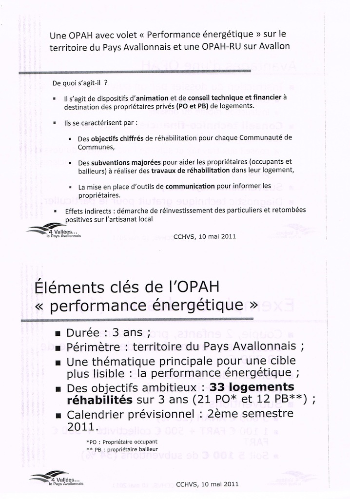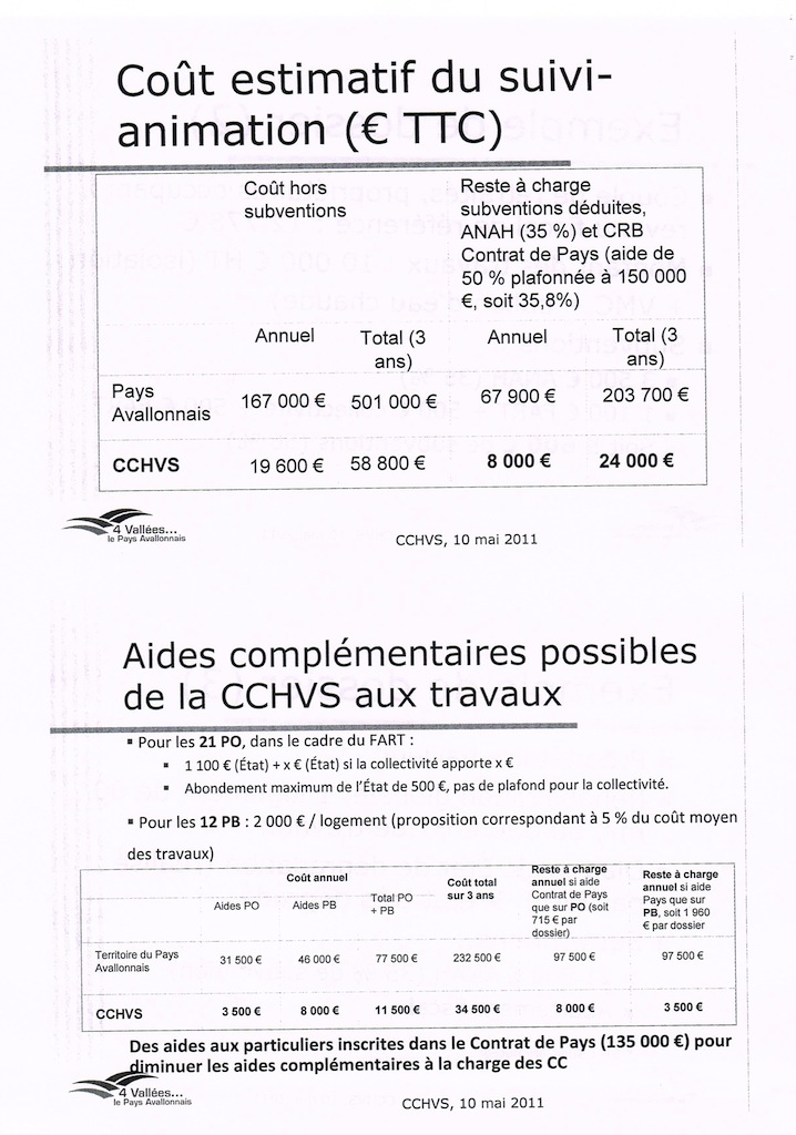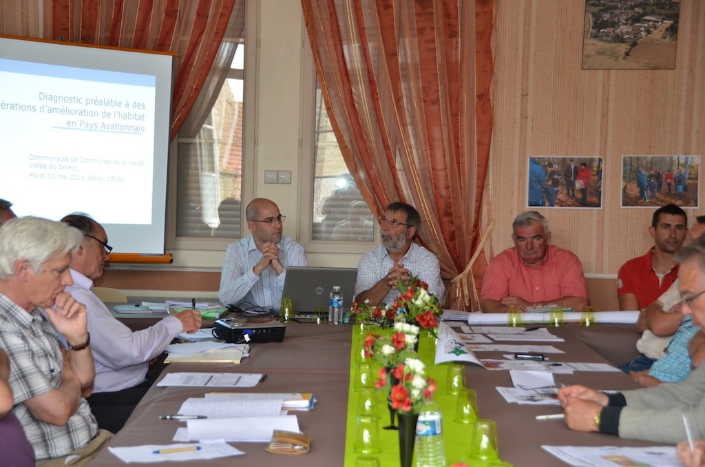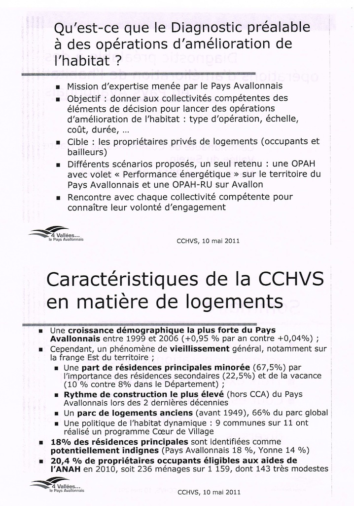 L’Isle le 10 mai: C’est à Blacy, que se tenait ce soir la réunion (presque) mensuelle des délégués de la Communauté de Commune de la Haute Vallée du Serein (CCHVS). Parmi les différents sujets à l’ordre du jour de la réunion, deux points majeurs d’informations. L’Opération programmée de l’Amélioration de l’Habitat présentée par le Pays Avallonnais, avec comme invité Julien Lavie pour défendre le sujet. Les documents ci-dessous reprennent les termes de Mr. Lavie. Ceux-ci nous informent du programme mis en place, ainsi que ses différentes dispositions. Trois exemples nous sont donnés dans trois profils de foyers, en rappelant que ce dispositif s’adresse à des particuliers propriétaires de leurs biens, dans le cas d’une amélioration de l’habitat soit en PO (propriétaire occupant), soit en PB (propriétaire bailleur). La dernière partie du document nous indique le coût estimatif du suivi-animation et les aides complémentaires possibles de la CCHVS aux travaux. Trois plaquettes d’informations destinées aux propriétaires (PO & PB) intéressées par ces dispositions et la liste des travaux entrant dans ces dispositions. l’animateur invite les délégués de la CCHVS à diffuser largement l’information auprès de leurs administrés. Deuxième point majeur de cette réunion, une discussion générale sur la réforme des collectivités territoriales, faisant suite à la réunion du CDCI, ce vendredi 6 mai en présence du Préfet du Département de l’Yonne, lors de laquelle ce dernier à présenté à l’assemblée un document de travail appelé « Projet de périmètre des Communautés d’Agglomérations et des Communes ». Ce document représente l’ensemble du département de l’Yonne dans ses nouvelles limites de communautés d’Agglomérations. Bien que ce ne soit, à priori, qu’un document de travail, des rumeurs laissent entendre que ce dernier pourrai être, à quelques détails prêts, le nouveau découpage du département de l’Yonne pour la grande réforme des collectivités de 2014. Le président de la CCHVS, JC Lemaire, après avoir longuement commenté le sujet à l’aide d’une projection des différentes pièces du dossier, en est arrivé à poser a l’assemblée, trois questions que voici