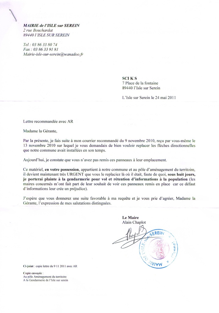 L’Isle le 26 mai: L’information est tombée hier par le bais d’une lettre du maire de L’isle sur Serein, envoyée en recommandée, (voir copie ci-dessous). Aujourd’hui, nous ne parlerons que des moyens de pression que le maire, Alain Chaplot tente d’exercer sur la Gérante de la SCI KS afin d’intimider un des associés, Serge Angeles. Il existe, en effet, depuis de nombreuses années des grieffes entre les deux individus, et la nomination de Alain Chaplot, au poste de maire lors des dernières élections municipales, n’a pas arranger les choses et se sont même aggravées (le sujet sera développé plus tard). Pour l’heure, les associés de la SCI KS ont décidés, lors d’un conseil d’administration extraordinaire, de saisir la justice et ont nommés Serge Angeles pour conduire les démarches, ce dernier ayant une parfaite connaissance du dossier. Comme nous l’avons vu plus haut, intimidation , chantage, diffamation et abus de pouvoir, sont les principaux chefs d’accusations qui seront retenus dans le premier volet de cette affaire. Le sujet en lui même porte sur des panneaux que la gérante aurai « volé » aux dires du maire, alors que ceux -ci mêmes ont simplement été déposés lors de travaux de façade et attendent, pour êtres reposées, l’intervention de l’EDF et de France Télécom. Des travaux de terrassements et de voiries sont liés à ces deux intervenants. La SCI KS a fait dans les délais légaux, ses demandes de déplacements. La municipalité et les fournisseurs d’énergie semblent faire la sourde oreille. Rappelons qu’il est question de réseaux et non de raccordements privatifs, de ce fait les frais incombent aux entreprises concernées.