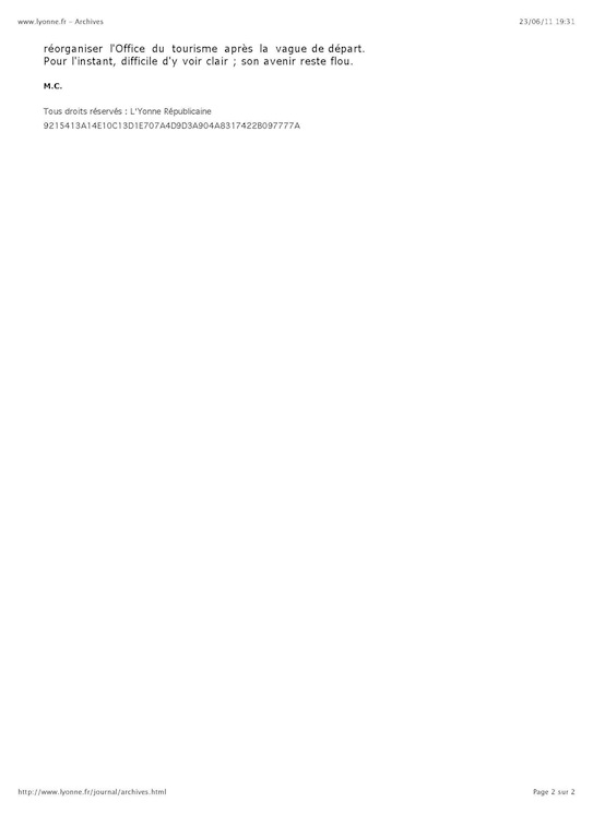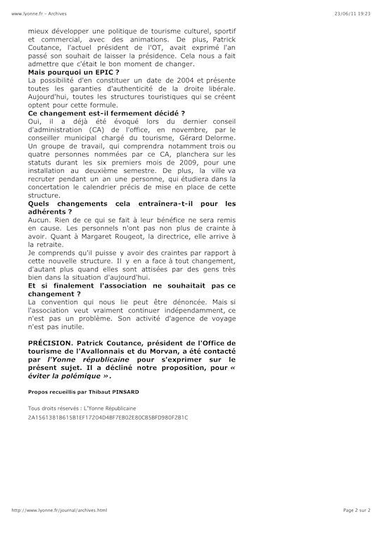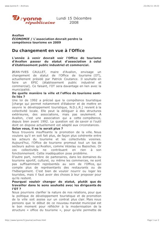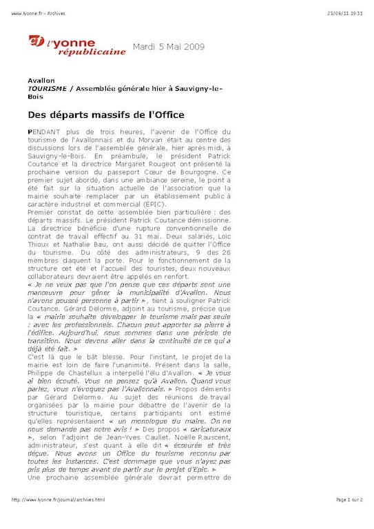 L’Isle le 23 juin: Si le touriste lambda ne se rend compte de rien lorsqu’il fait une halte dans la région Avallonaise , il semblerai que du coté des responsables de la branche touristique régionale, il en soit tout autrement. Après avoir changé son site (en le rendant payant pour les annonceurs) en début d’année, … réussi à perdre un partenaire (CCHVS), … voici que, maintenant, le mal viendrai de l’intérieur. Il aura fallu deux mois à certains décideurs du conseil municipal d’Avallon pour se rendre compte de leur « mauvais » choix. Pire encore, la vie privée prend le pas sur la compétence. Pas de doute nous sommes bien en France. À l’heure ou les destinations Nord-Africaines se voyaient boudées à cause d’un climat politique « un peu tendu », une destination Hispano-Grèque « un peu » en crise et le sud de la France « un peu » surestimé, les acteurs du tourisme local se seraient bien satisfait de cette situation en développant le tourisme vert. C’était sans compter sur le dysfonctionnement des organisations touristiques télécommandées par les autorités locales. Climat difficile qui risque de transpirer sur le personnel ainsi que sur le rapprochement intercommunautaire engagé depuis ces dernières semaines, ou là aussi … grand chahut , (… au grand dam de certaines communautés voisines). Et au 6 de la rue Bocquillot, … ça se passe comment? (après ces grandes réformes des années passées comme en témoignent les articles de la presse locale). À lire aussi les deux coupures de presse à l’origine de ce topic, en fin de page.