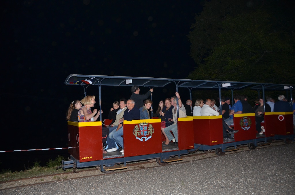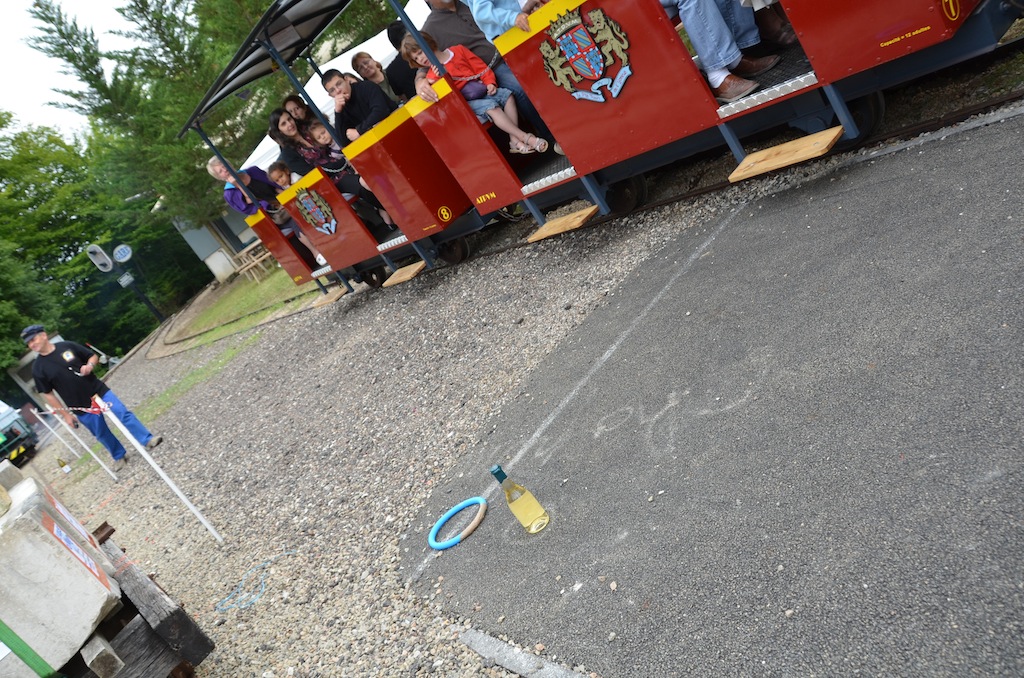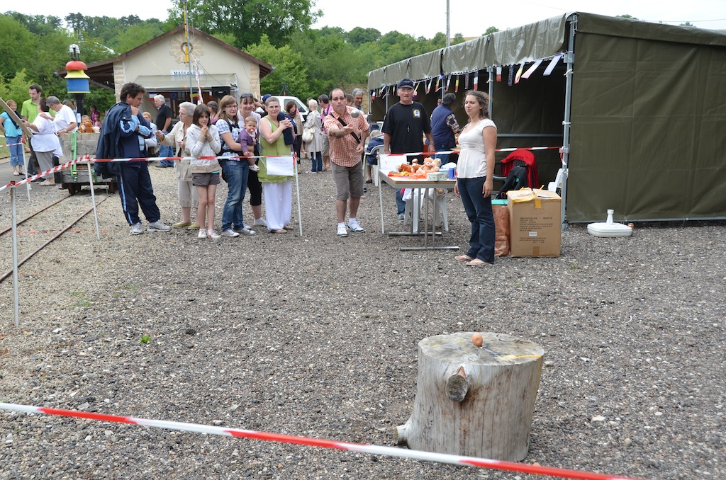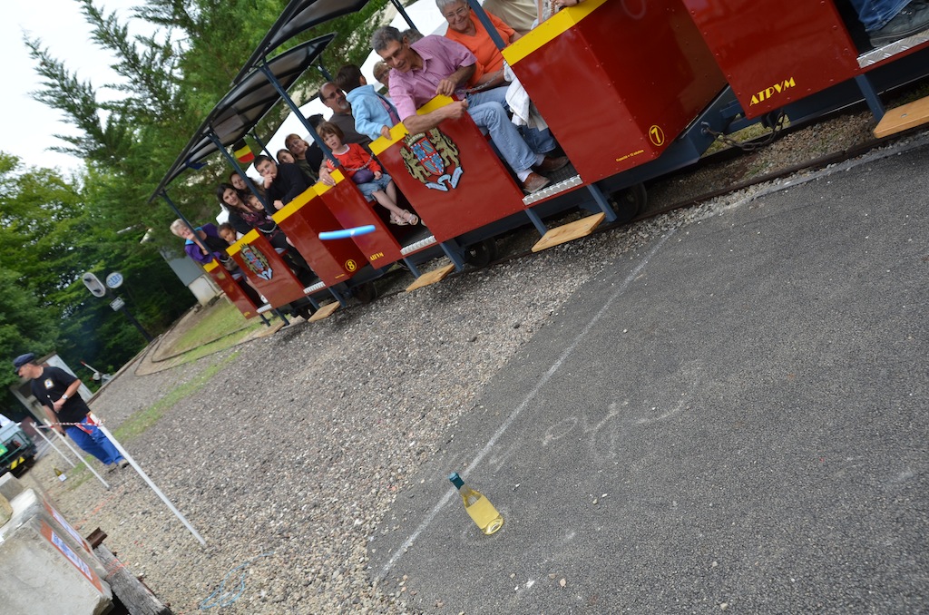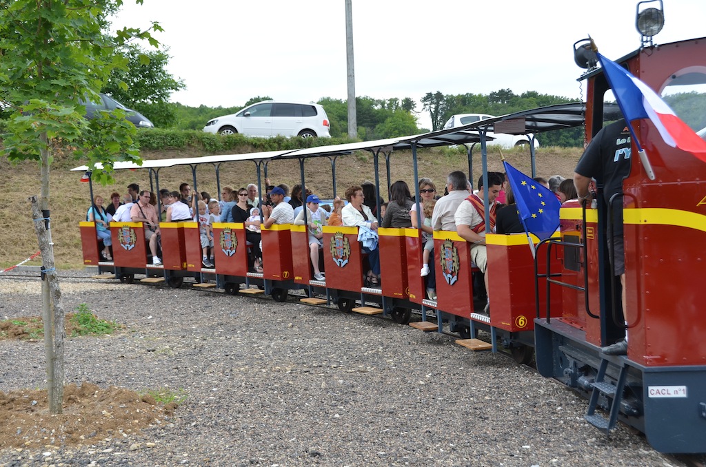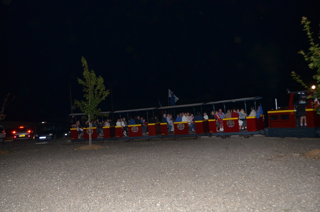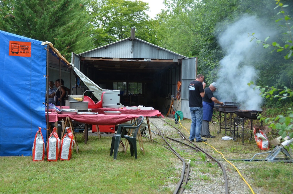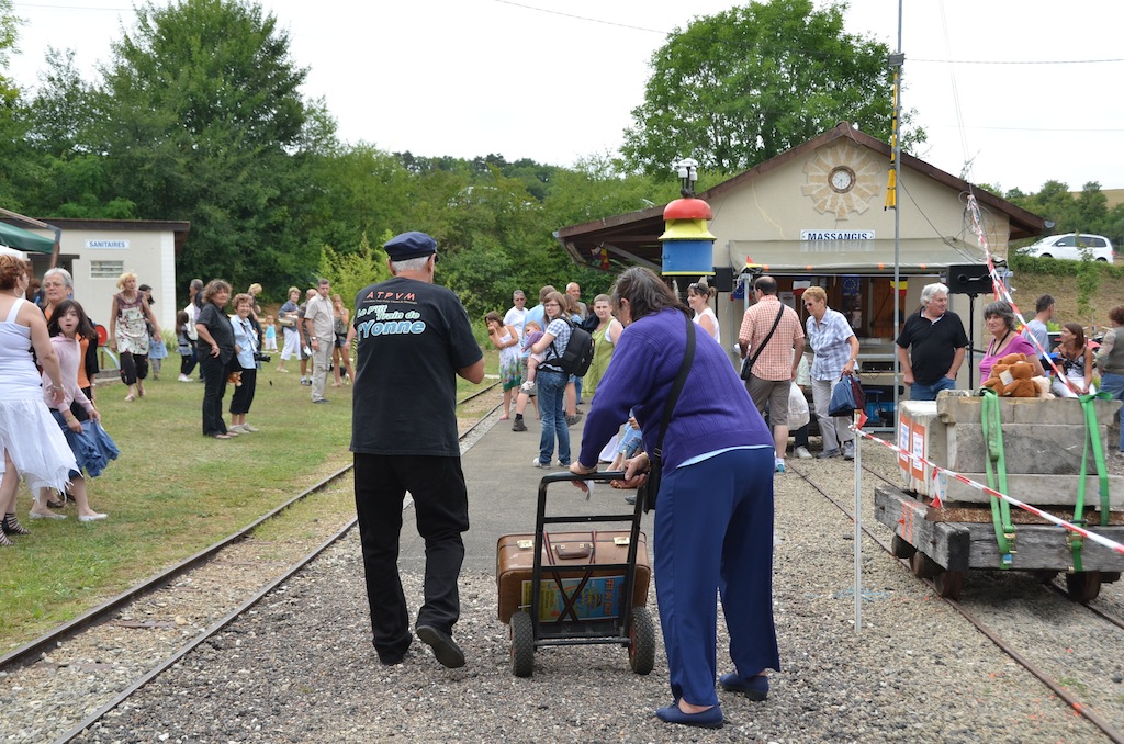Massangis, le 16 juillet: On ne peut pas parler du tacot de Massangis sans faire un bon en arrière (100 ans) et expliquer l’origine du »Tacot ». Le « Tacot » est le nom d’une des nombreuses voies de chemins de fer départementales qui sillonnaient la région à la fin 19ème siècle. Cette ligne (le tacot) qui reliait L’Isle-Angely à Laroches-Migennes a, pour sa part, fonctionné des environs de 1890 à décembre 1951 fin officielle de l’exploitation de celle ci. Le « Tacot » sous sa forme actuelle est un petit train de randonnée qui occupe un tronçon de l’ancienne voie. Sa longueur totale est d’environ 3,5 km et ce dernier met 50 mn pour les parcourir, le but étant d’allier tourisme et plaisir. L’idée de ces installations a germée dans la tête d’un passionné de trains miniatures lorsqu’un jour, ayant accompagné son fils à la pêche, il découvrit le long du fossé un tas de ferrailles dans lequel se trouvait bon nombres de tronçons de rails de voies étroites dites « voies decauville » (la marque) que l’on trouvait fréquemment sur les grandes installations (usines et autres) de l’époque. De la détermination et une bande de copains ont fini par mettre à jour ce petit train (tout a été construit, locomotive, wagons, aiguillage, etc…). Cela ravi, chaque année, petits et grands lors de leurs passage dans la région. D’année en année, les installations se sont étoffées de gare, hangars et autres, pour les besoins du fonctionnement. C’est aussi devenu un lieu incontournable au moment de sa fête, dite « La Fête du Tacot », à la mi juillet. Cette année encore, la manifestation a attiré un très grand nombre de visiteurs, tant pour la ballade, que pour toutes les activités et jeux d’adresses proposées en journée, ainsi que le grand repas du soir. Trois beaux moutons attendaient les convives, et une gerbe de feu a salué les derniers voyageurs, la nuit tombée. Seule la pluie n’était pas au rendez-vous, malgré un temps légèrement maussade, laissant quand même passer quelques généreux rayons de soleil.