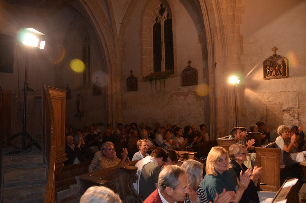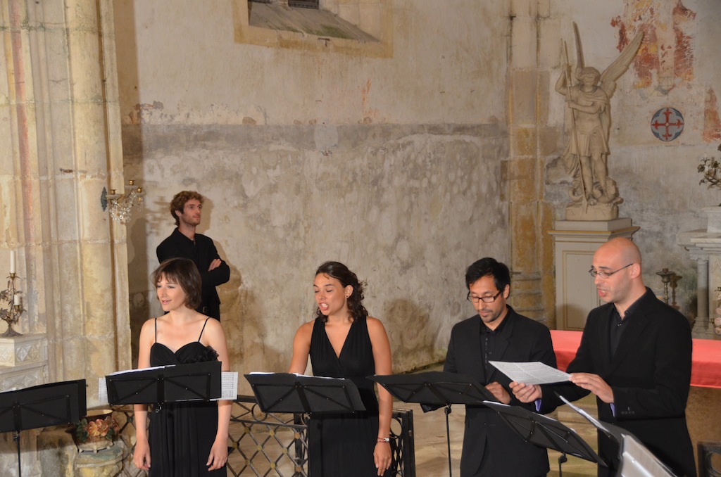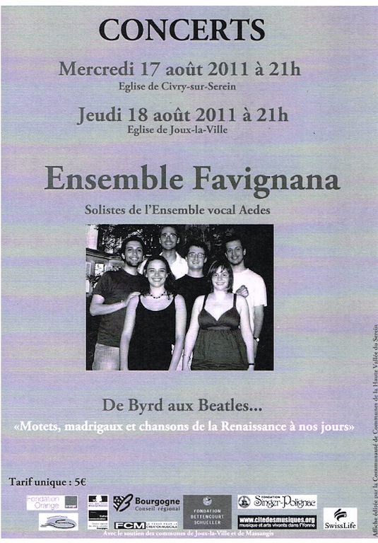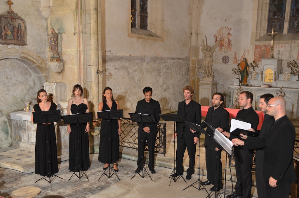 Civry le 17 août: Ce soir l’église de Civry ouvre ses portes pour accueillir « L’Ensemble Favignana », composé en partie des solistes de L’ensemble Aedes, une formation bien connue dans la région, née à Civry même, il y a 6ans. À l’affiche, « Motets, madrigaux et chansons de la Renaissance à nos jours » sous le titre « De BYRD aux BEATLES ». De « Haec dies » de William Byrd à « It don’t mean a thing de Duke Ellington/Irving Mills en passant par … De Lassus, Mendelson-Bartholy, Debussy, Ravel, Genée et autres grands auteurs, cette formation de neuf voix (ce soir), en sopranos, mezzo, ténors, barytons et basse à su séduire un public de pas moins de 100 personnes venu pour l’occasion.