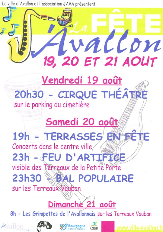 Avallon le 20 août: Une décision de dernière minute nous dirige vers Avallon pour le dîner de samedi soir. C’est en voyant les accès véhicules bloqués vers le centre ville que nous nous rappelons la fête à Avallon. Et bien soit! allons y. Petite place pour la voiture et direction le centre ville sur nos godasses. Une place en terrasse au Chapeau Rouge, dîner en musique venant de l’orchestre installé place vauban. La fin du repas se fait sur un concert de fusées multicolores. Une fin de soirée vers la place des « Terraux Vauban » d’où il émane la musique du bal de la soirée,  jouée par le groupe « Entre Nous ». Une soirée fort agréable, sous une très légère brise venant rafraîchir un samedi caniculaire.