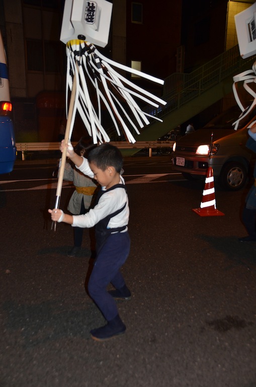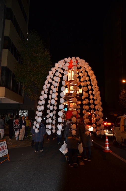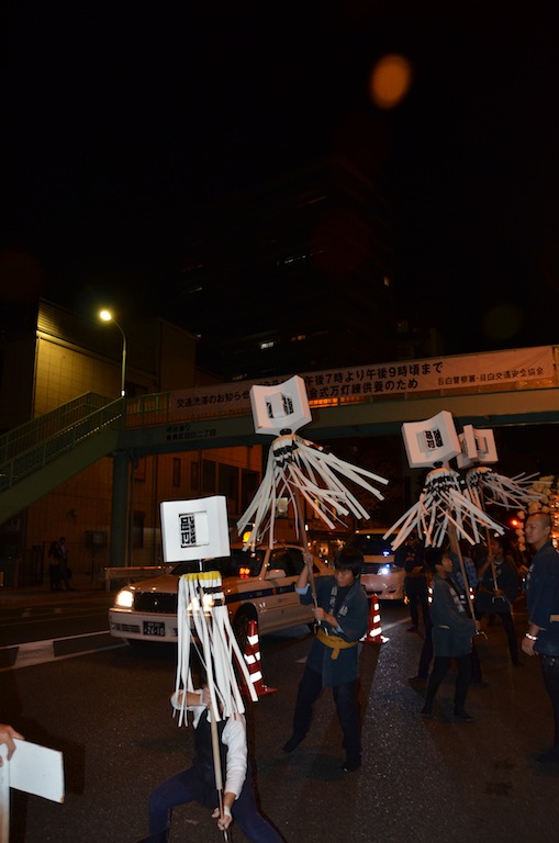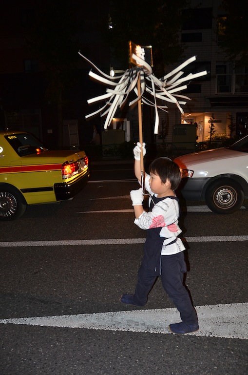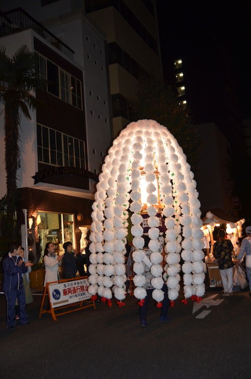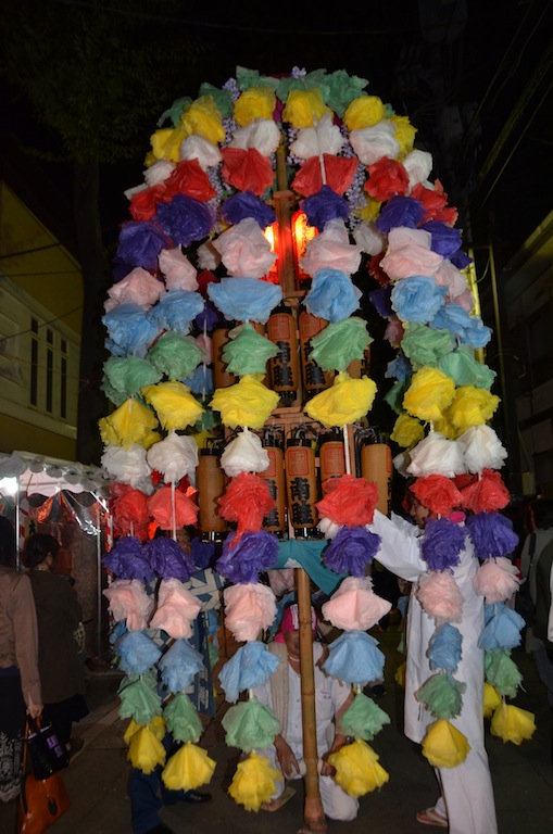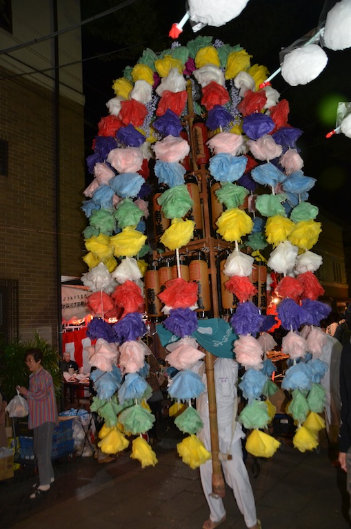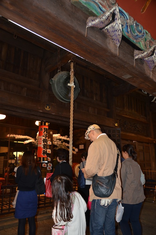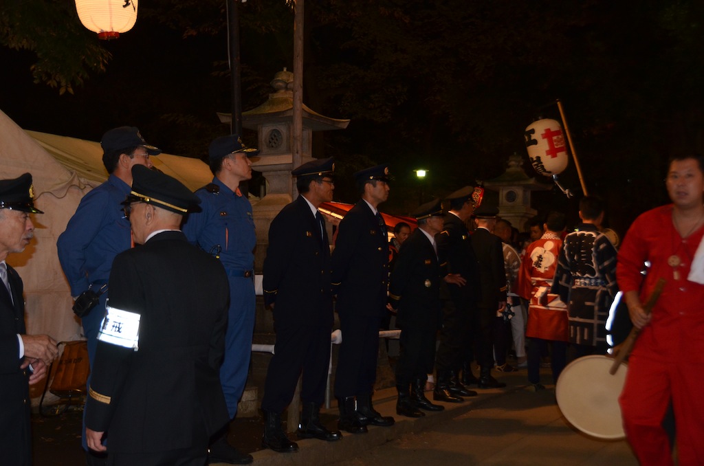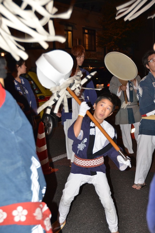 Tokyo le 18 octobre: Kishi Bojin, c’est le nom que donnent les vieux, et moins vieux, habitants dans ce quartier de Toshimaku, à cette fête qui réuni autour du Temple , bon nombre d’habitants du secteur et d’ailleurs. Cette fête qui dure trois jours se déroule principalement en soirée dans les espaces autour du temple ou l’on trouve une multitude de petites échoppes vendant essentiellement de la nourriture. Un peu plus loin, ont été installé sous des abris de toiles , des espaces remplis de tables et de bancs, permettant d’accueillir le public et les participants de cette fête. Une fête de cette envergure suscite de la curiosité, et une chose peu banale que l’on rencontre de plus en plus, c’est que bien souvent les participants de ces grands rassemblements, ne connaissent pas les origines de celui-ci. … Ça concerne qui? La réponse viendra d’un ancien en parlant de « Nichiren » ( un bel article sur wikipédia parle du personnage). Cette fête est reliée à un évènement particulier? … si le » bien sûr » est plutôt collectif, les raisons en sont très différente. Si pour les uns, cette fête célèbre la naissance, pour les autres, c’est pour sa mort que cette fête est célèbrée. La consultation des archives donnerai raison aux seconds en apparence, car cette manifestation se déroulant autour du 15 octobre correspondrai plus à la mort de Nichiren (le 13 octobre 1282, wikipédia toujours). Pour le public, c’est beaucoup plus simple » …c’est comme ça depuis plus de 400 ans « … « c’est une fête annuelle » … (Pour ceux là, la théorie des 10 singes s’applique sans aucun doute). Un peu plus tard dans la soirée, un grand nombre de participants se rassemblent dans un cortège en multiples groupes portant des tenues différentes. Cette année et dans ce quartier, ils seront au nombre de 35 (un ancien se souvient qu’il y a quelques années, ils pouvaient être 400). Ces groupes sont en fait des associations représentatives du quartier, qui évoluent dans des activités et domaines tout aussi variés les uns des autres (sportifs et culturels en majorité). Elles respectent toutes le même ordre de formation au sein du cortège et est ainsi constitué: devant, les emblèmes, suivent les danseurs et les musiciens, le symbole, quand à lui, fermera le groupe. Pour ce dernier les réponses aux questions ont toutes été identiques: « ce symbole représente un cerisier en fleur …. l’histoire dit que le jour de la mort de Nichiren, un (ou plus) cerisier à fleuri! ….. La procession fera ainsi le tour du quartier avant de se retrouver devant l’autel du temple pour recevoir la bienveillance du moine et formuler des vux. Une soirée dans le calme et la joie sous l’il protecteur des représentants de l’ordre. A suivre en images, cette soirée de liesse.