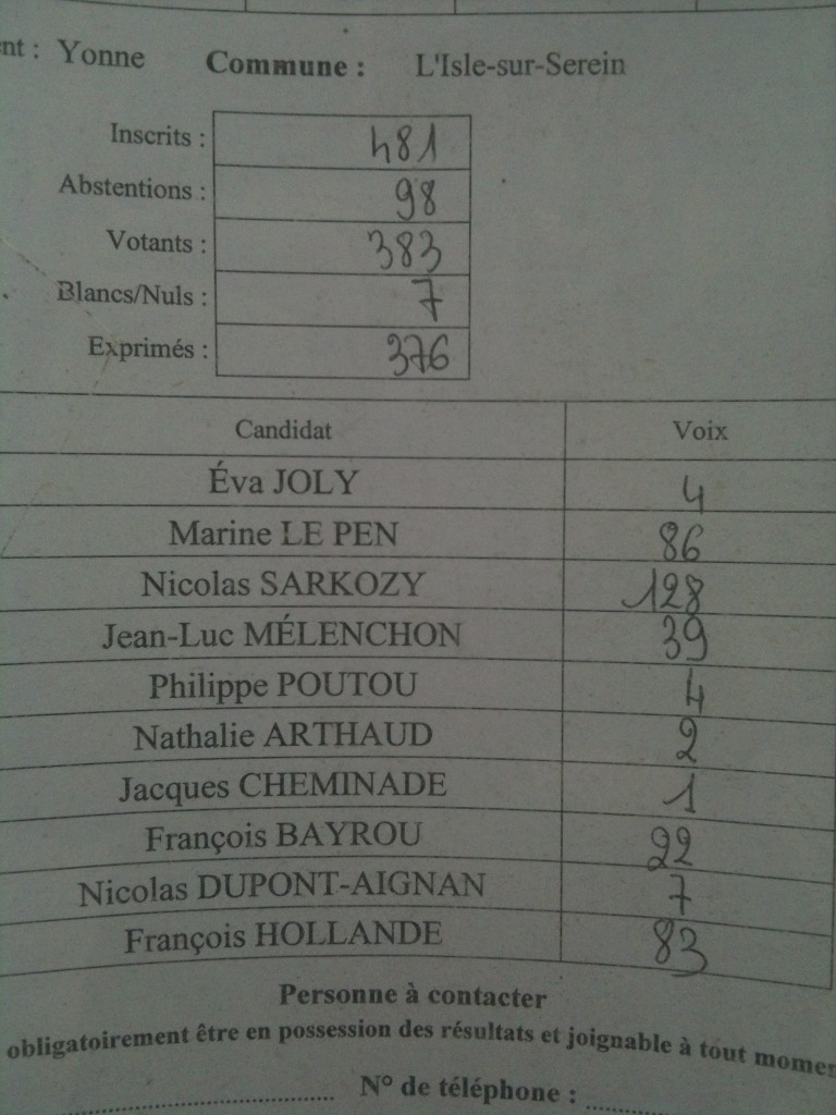 L’Isle le 22 avril: Pour ceux que cela intéresse, voici les résultats du 1er tour des élections présidentielles à l’Isle sur Serein.