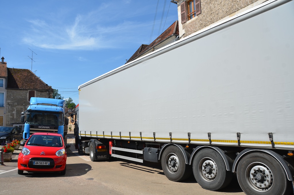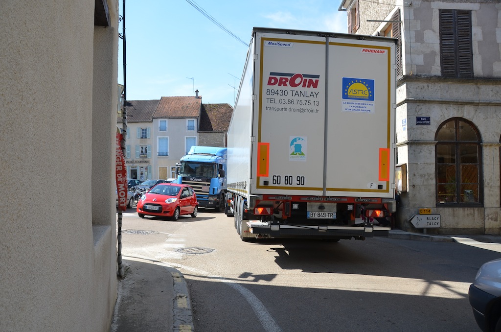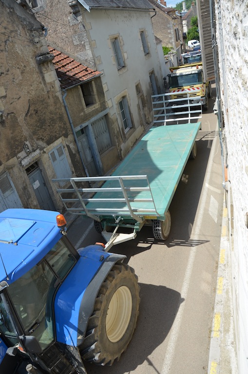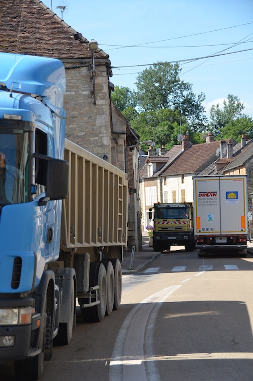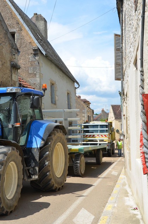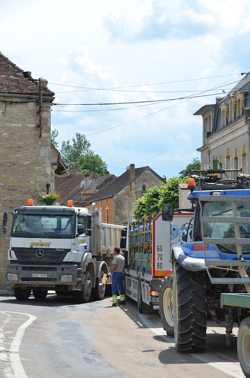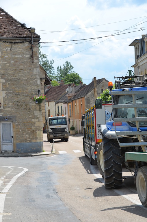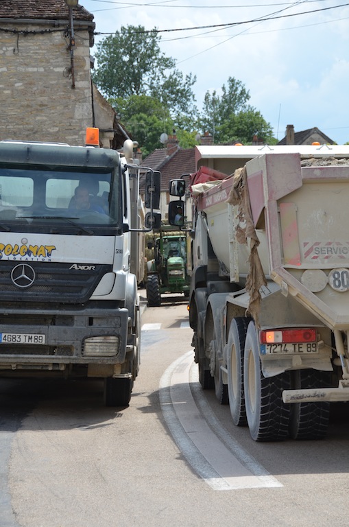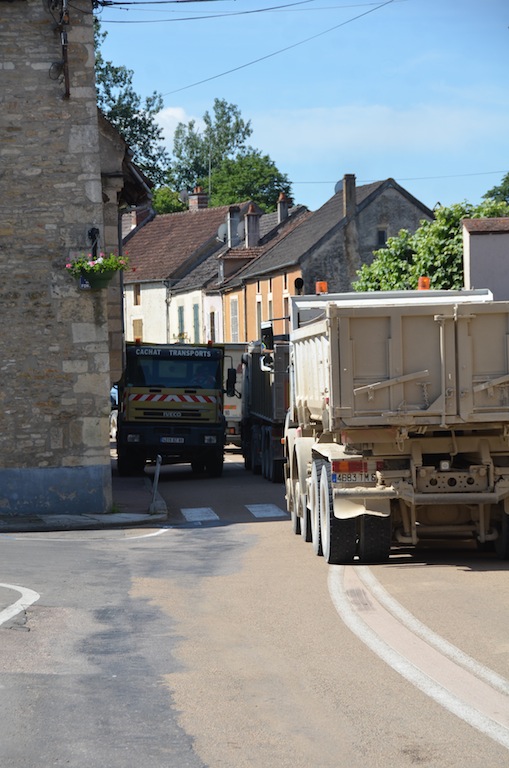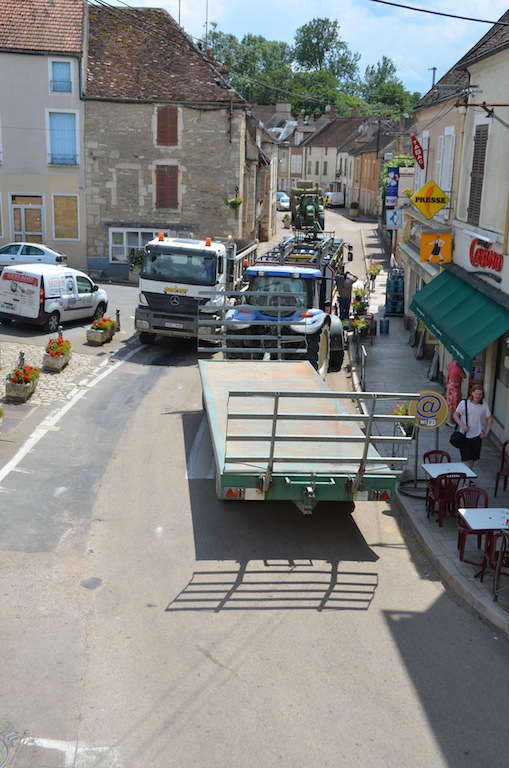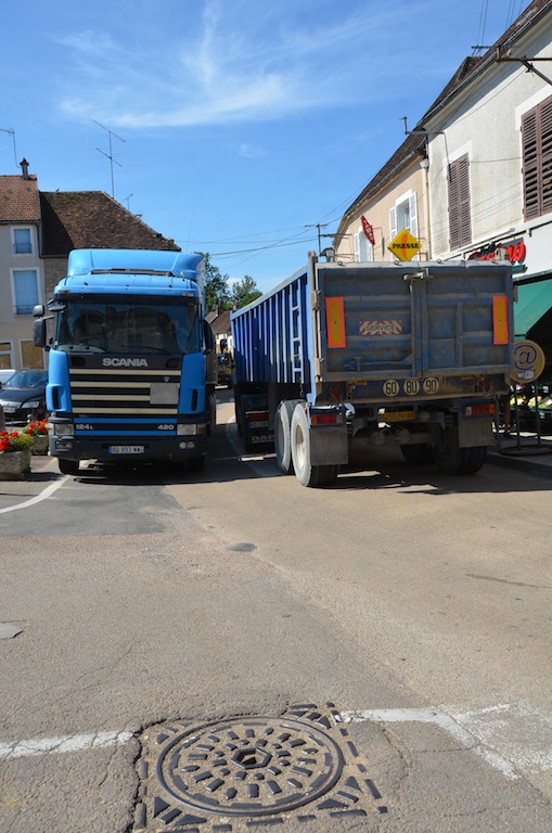 L’Isle le 4 juillet: Bienheureux le citadin qui, après onze mois de dur labeur, va enfin pouvoir faire une pause bien mérité. Pour les quelques semaines à venir, celui-ci pourra passer des vacances tranquilles si il respecte deux conditions. La première consiste à prendre soin d’éteindre son portable car depuis peu , l’opérateur Orange à décidé de ne plus vous laisser en paix dans l’Isle et ses environs proches. La seconde est que comme l’année passée, il faudra éviter le centre village compte tenu d’une circulation digne d’un environnement urbain. Hé oui! « Ils » ont remit ça. Souvenez vous l’année passée la densité de circulation paysanne, moisson oblige, avait été renforcé par les installations du parc photovoltaïque de Massangis et ses 100 000 tonnes de remblais. Cette année ce ne sont pas moins de 80 000 tonnes de cette « précieuse » matière qui vont réintégrer leurs dépôts respectifs, et de ce fait, refaire le chemin en sens inverse. NON …. ils ne re-démontent pas la centrale solaire comme on a pu l’entendre ici et là, mais simplement les plateformes de stockages. Certes, une information qui, somme toute a été omise. Probablement pour ménager les habitants de L’isle et des villages voisins compte tenu d’une gène non négligeable en cette période estivale où il fait bon ouvrir ses fenêtres. Les parisiens et autres citadins doivent bien rire en ce moment, en regardant vivre le monde rural en « mode embouteillage ». ……Voyez plutôt!!!! … On observera, au passage, des convois bien ordonnés. … Dans un sens, des camions pleins et des remorques fourragères vides et dans l’autre sens, c’est exactement le contraire.
