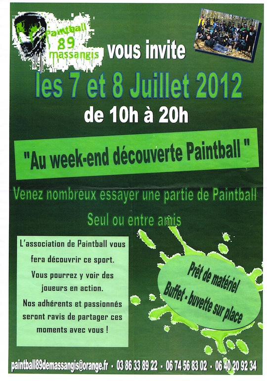 Massangis le 8 juillet: Week end chargé en adrénaline pour tous ceux qui ont répondu à l’invitation de « Paintball 89 Massangis ». Cette jeune association organisait ces 7 & 8 juillet un « Week end découverte Paintball », dans le but de faire découvrir ce sport au public, pas toujours bien compris par celui-ci. Si l’on remonte aux sources de cette pratique, on comprend vite que celle ci trouve ses racines dans le marquage du bétail au cours des années 80. Ce sont les Australiens qui en sont à l’origine, avant d’arriver en Europe autour des années 90. Très vite les auteurs en ont fait un jeu , ainsi est né le paintball. Aujourd’hui, »Paintball 89 massangis », compte une quarantaine d’adhérents et trace sa voie dans les réunions de groupes. Cette activité s’adresse à tout public, y compris aux jeunes sportifs. Du débutant au joueur confirmé, chacun s’y retrouve. L’association met à disposition des visiteurs, tout le matériel nécessaire à la pratique de ce sport et accompagne le joueur dans ses débuts, notamment en l’invitant sur le parcourt du « Père Noël ». En images, ce que les joueurs vont découvrir ……../