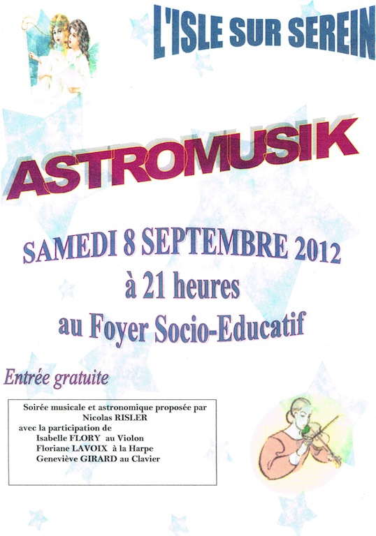 L’Isle le 8 septembre: Merveilleuse soirée proposée par Nicolas Risler avec la collaboration d’Isabelle Flory au violon, Floriane Lavoix à la harpe et Geneviève Girard, ce samedi soir ou pas moins de 70 personnes étaient venu partager la passion astro-musicale de ce quatuor. Astronomie et musique ont tour à tour passionné le public avec notamment cet « Avé Maria » dont voici un extrait ci-dessous.