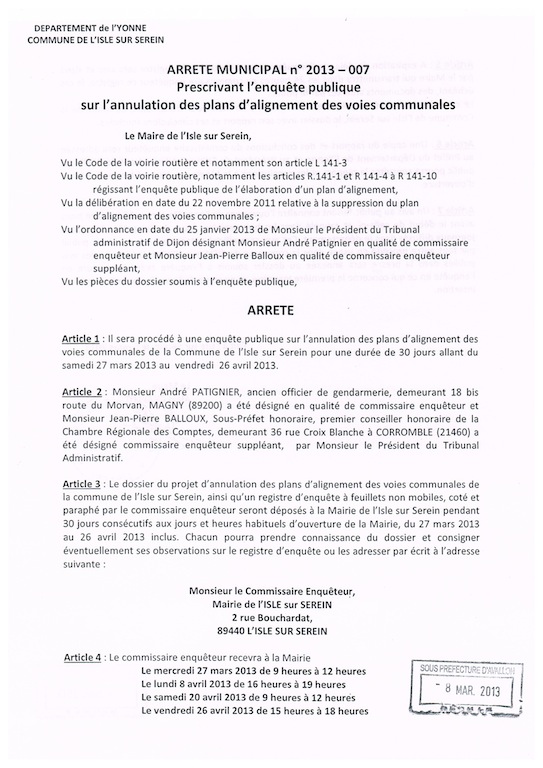 L’Isle le 31 mars: Chaque habitant de l’Isle sur Serein a probablement reçu ces derniers jour dans sa boite, une circulaire annonçant le projet de suppression des plans d’alignements qui frappent bon nombre de maisons sur l’ensemble du village. Ce tracé d’alignement, pour L’Isle sur Serein, trouve son origine dans les plans établis au second Empire. Des plans datant de 1860, indiquent les limites de voiries et emprises sur les immeubles à proximité de la voirie. Lorsque l’on observe le cadastre actuel, on constate que peu de choses ont changées. Si, au demeurant, les services de l’état décidaient d’appliquer ces limites, le village s’en trouverai largement amputé. Un clin d’il sur l’auteur du projet de suppression de ces dites limites, l’actuel président de la CCHVS, qui, dans l’hypothèse, verrai sa maison coupée en deux. Il est aussi bon de préciser que cette mesure ne concerne que la voirie communale, autrement dit, les maisons en bordure des départementales qui traversent le village ne sont pas concernées. Sur le fond, il semble bon d’approuver ce projet sur son ensemble, communal et départemental, si l’on souhaite conserver un équilibre dans l’aspect du village. Une enquête publique est d’ores et déjà ouverte dans ce sens.