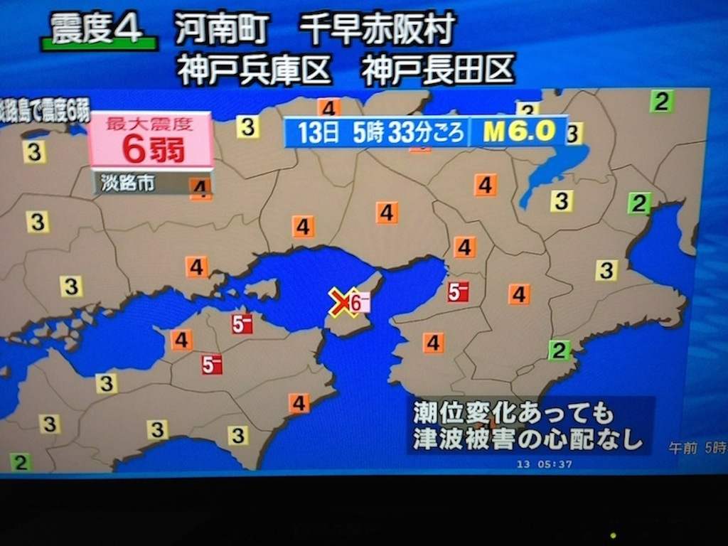 Ce matin du 13 avril 2013, la terre a tremblé à 5h35 heure locale. Une secousse de force M6, d’une durée de 30 secondes, a été ressentie sur l’île, déterminée comme zone de l’épicentre. Aucun dégât, dans ce secteur, n’est pour l’instant annoncé. Des hélicoptères de l’armée survolent les zones concernées pour identifier les dégradations éventuelles. Quelques trains arrêtés et vérifications diverses sont en cours. Les chaines de télévisions locales passent l’information en boucle et prodiguent les conseils de base dans ce genre de situation. Probabilités de quelques secousses de traines sont à prévoir sans plus de gravité selon les commentaires des spécialistes. Pas de tsunami annoncé.