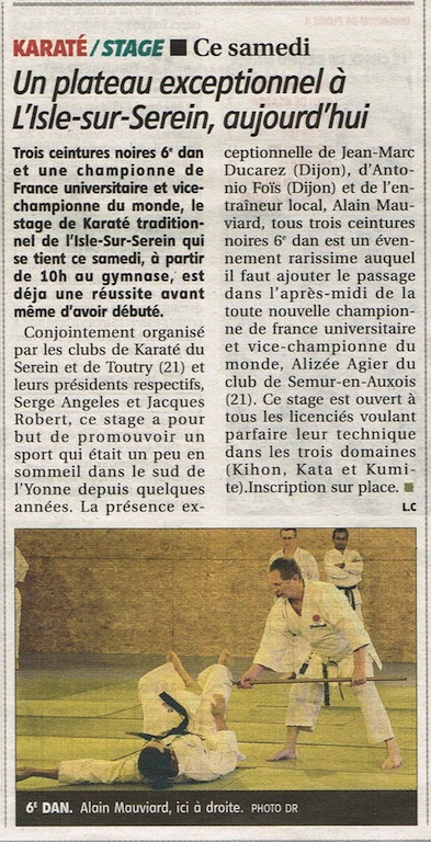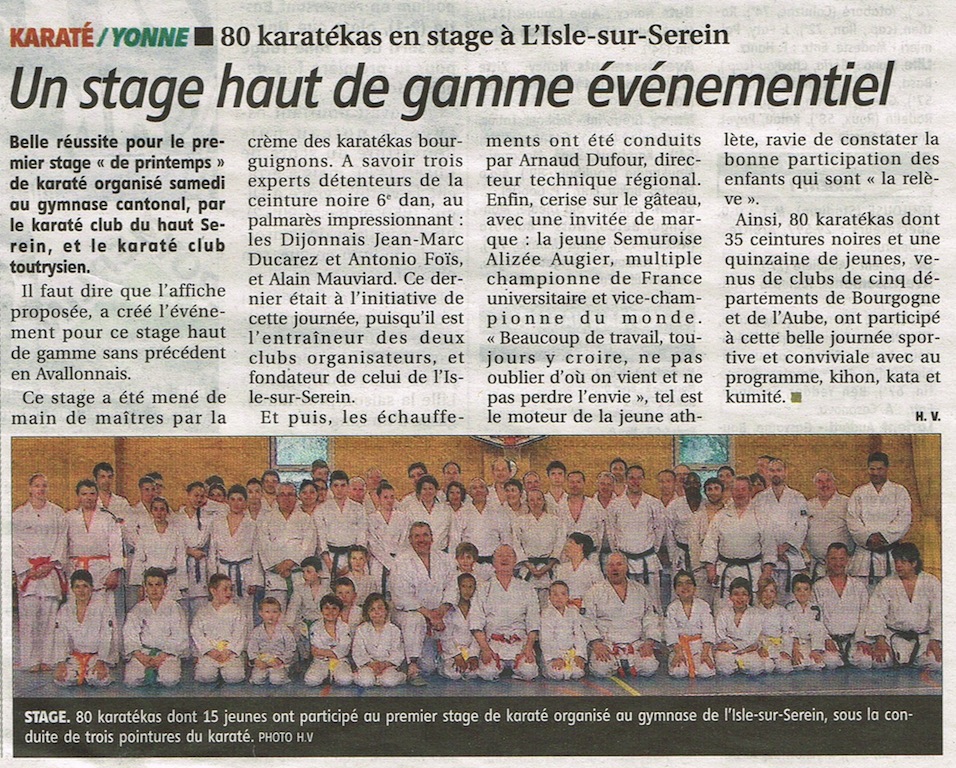 Une première dans le canton que ce stage de karaté organisé conjointement par le club de Toutry (Côte dOr), et celui de L’Isle sur Serein (Yonne) sur une idée de leur entraineur Alain Mauviard, qui dispense les cours dans les deux clubs. Pour l’accompagner dans cette  journée exceptionnelle, Antonio Foïs et Jean-Marc Ducatez, tous deux de Dijon.