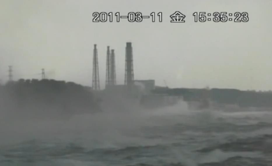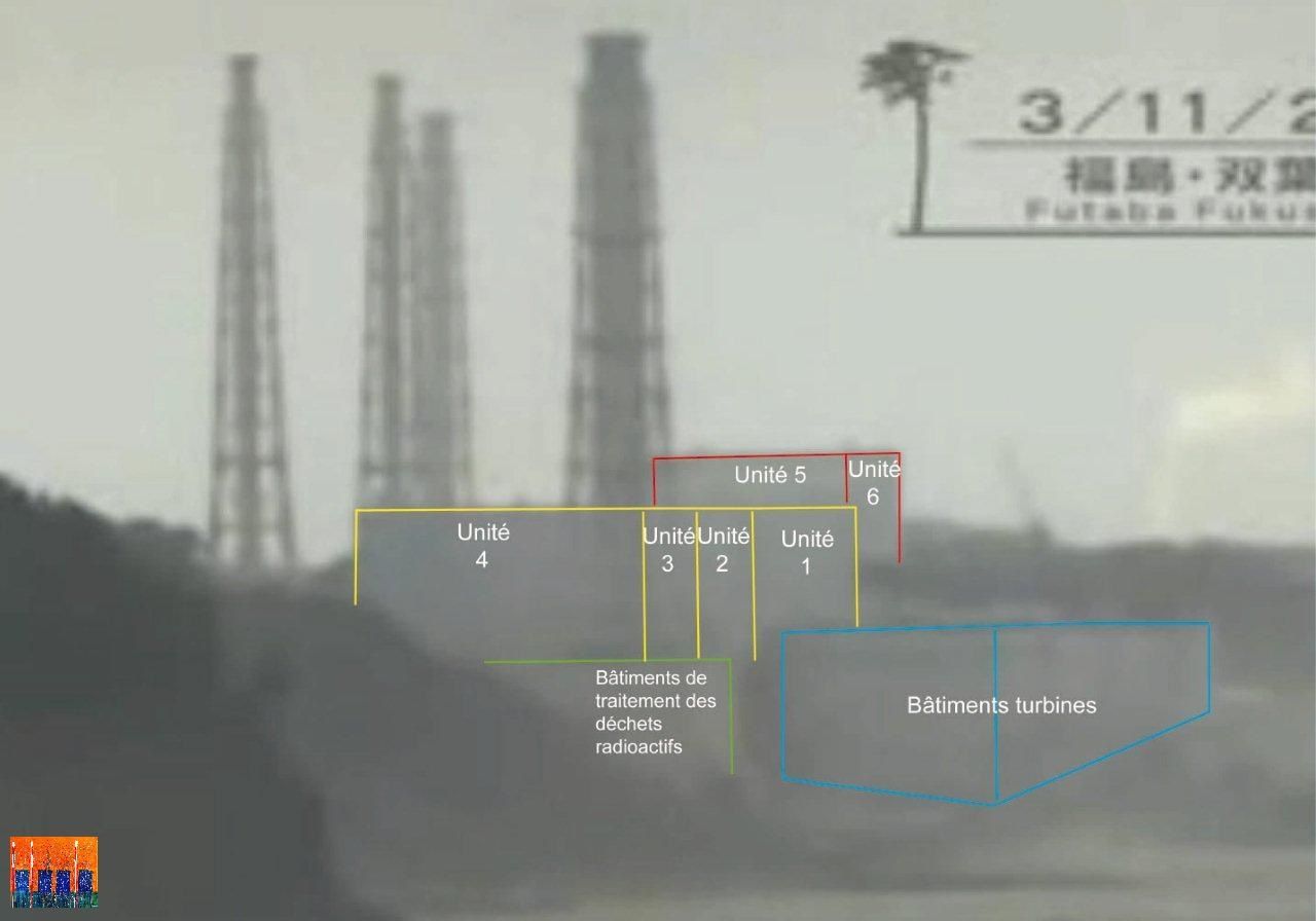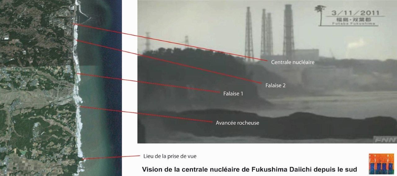 Ce qui est très intéressant dans cette vidéo, c’est sa relative netteté et les informations nouvelles qu’elle met au jour : hormis la violence des vagues frappant la falaise, on peut observer très nettement que le site, au niveau des unités 1-2-3-4, laisse échapper des panaches de vapeur provenant de deux endroits différents. Au temps 3’28, une réplique sismique a lieu et immédiatement se forme un énorme panache côté est. Il est possible qu’à ce moment-là, au moins un panneau-évent était déjà tombé et que la vapeur provenait directement de cette ouverture de sûreté. Cette observation tend à montrer qu’au moment du tsunami, il existait déjà une grande chaleur dans au moins un des bâtiments réacteurs et donc que le tsunami n’était pas responsable de ces rejets de vapeurs.