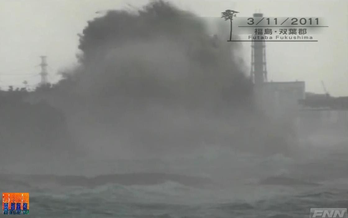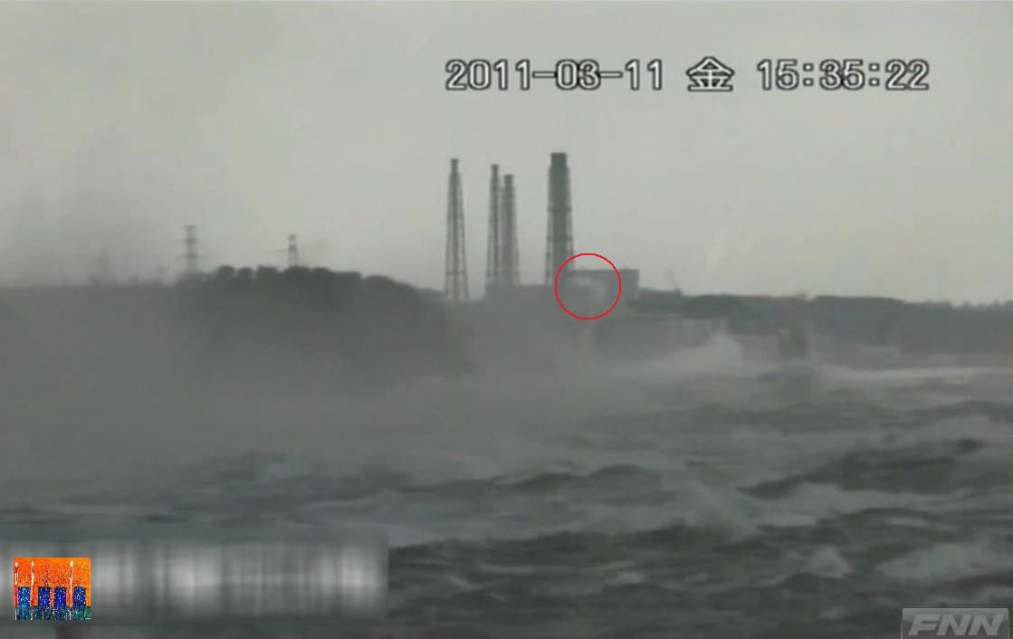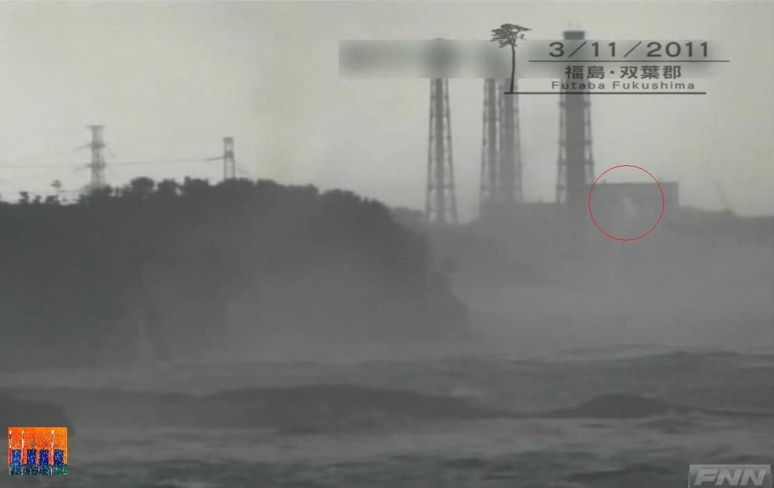La deuxième séquence montre un zoom sur la centrale. On voit une vague se fracasser sur le côté sud-est de la centrale, mais la vision est insuffisante pour savoir où a lieu l’impact, qui probablement est situé plus au sud que ce qu’on pense.