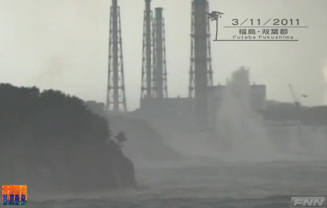 J’ai trouvé ces images de la chaîne japonaise FNN au hasard de mes recherches. Elles ne semblent pas avoir été très diffusées, allez savoir pourquoi. C’est une vidéo de l’arrivée du tsunami sur la centrale de Fukushima Daiichi, vue du sud. La prise de vue est réalisée avec un téléobjectif, probablement depuis un éperon rocheux à 6 km au sud, ce qui permet d’avoir cet angle de vue. On voit les quatre cheminées du site nucléaire, l’unité n°4 qui est juste derrière la plus grosse cheminée en premier plan, l’unité 1 qui se dégage car décalée par rapport aux unités 2, 3 et 4, et les unités 5 et 6 en arrière-plan surélevé.