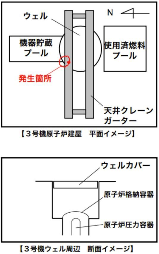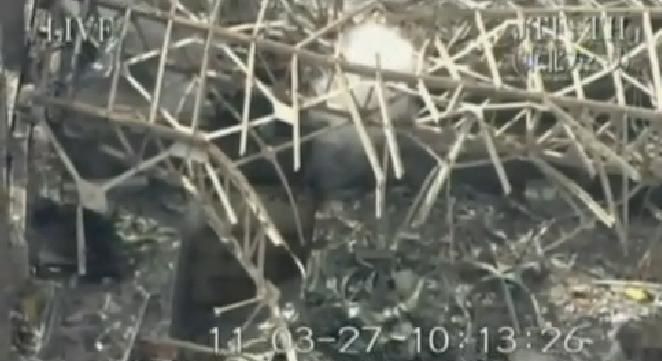 En fait, Tepco fait semblant de ne pas savoir, comme d’habitude. Il faut revenir en mars 2011 pour comprendre ce qui se passe. Une vidéo aérienne prise le 27 mars 2011 montre très clairement que le confinement du réacteur 3 était atteint après l’explosion du 14 mars 2011. Voyez ce cliché extrait de cette vidéo : de la vapeur s’échappe du centre du bâtiment en ruine, côté nord. On distingue bien la fosse de rangement de matériel, et la vapeur qui s’échappe à sa droite.