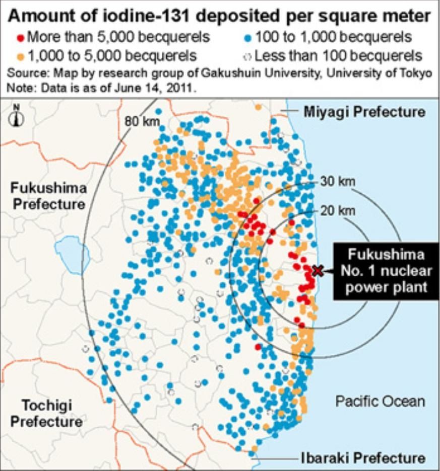 Des chercheurs, dirigés par Yasuyuki Muramatsu, un professeur de chimie analytique à l’Université Gakushuin, et Hiroyuki Matsuzaki, un professeur en génie appliqué à l’Université de Tokyo, ont estimé la quantité d’iode-131 déposé dans le sol en fonction de la concentration dans le sol de l’iode-129, à 400 endroits à moins de 80 kilomètres de l’usine. Le groupe de recherche en a réalisé une carte dont les données datent du 14 juin 2011. Cette carte montre que les niveaux d’iode-131 étaient relativement élevés dans les zones au nord-ouest de la centrale, ainsi que sur des sites au sud de l’établissement.