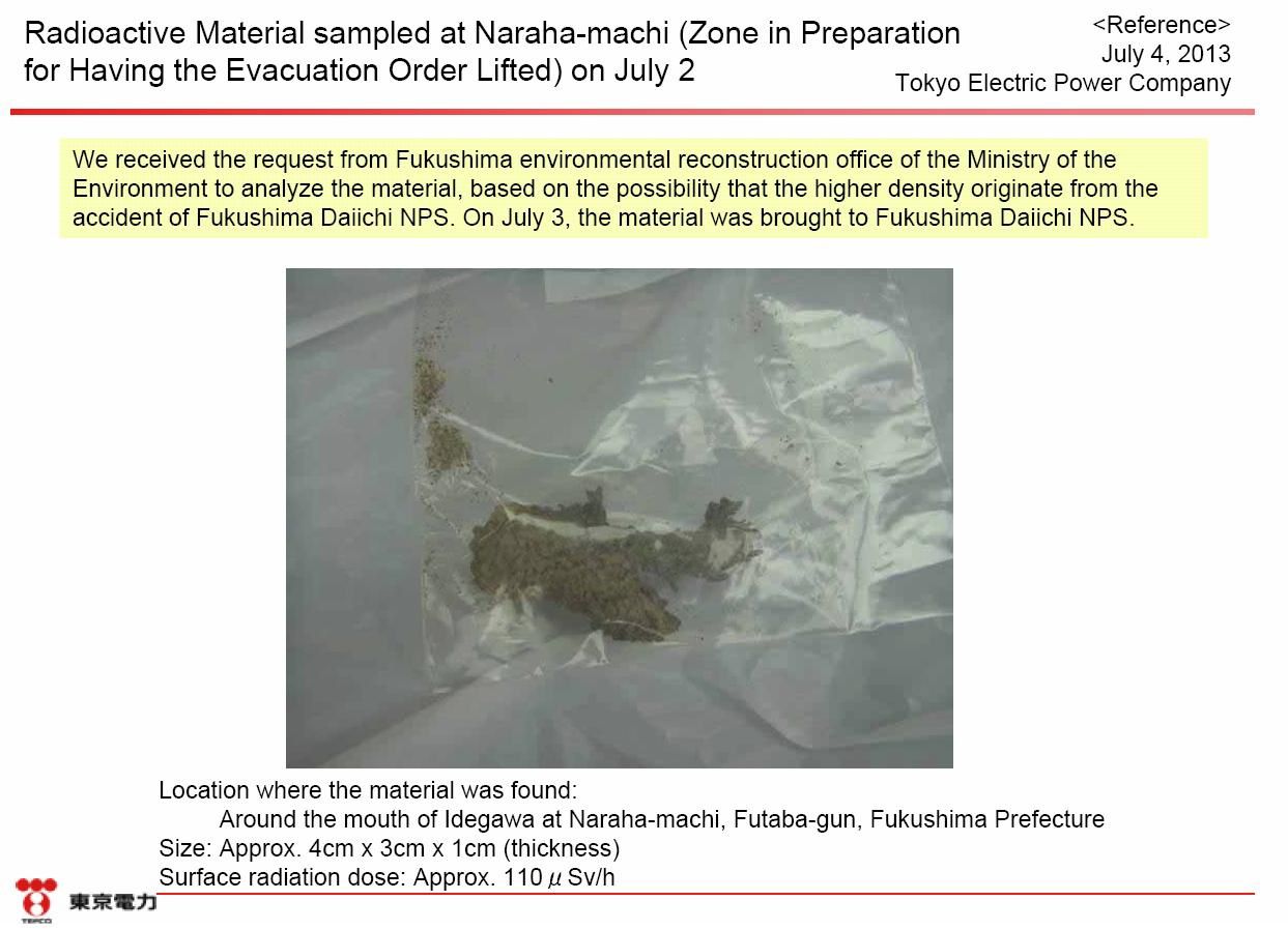 Le 20 juin puis le 2 juillet 2013, des débris fortement radioactifs ont été découverts dans le lit asséché d’une rivière de Nahara. Bizarrement, c’est Tepco qui a récupéré ces débris pour analyse, alors qu’ils se trouvaient à 20 km de la centrale de Fukushima Daiichi. Leur débit de dose est de 3,4 millisieverts par heure. Ils pourraient provenir de l’explosion d’un bâtiment réacteur en mars 2011.