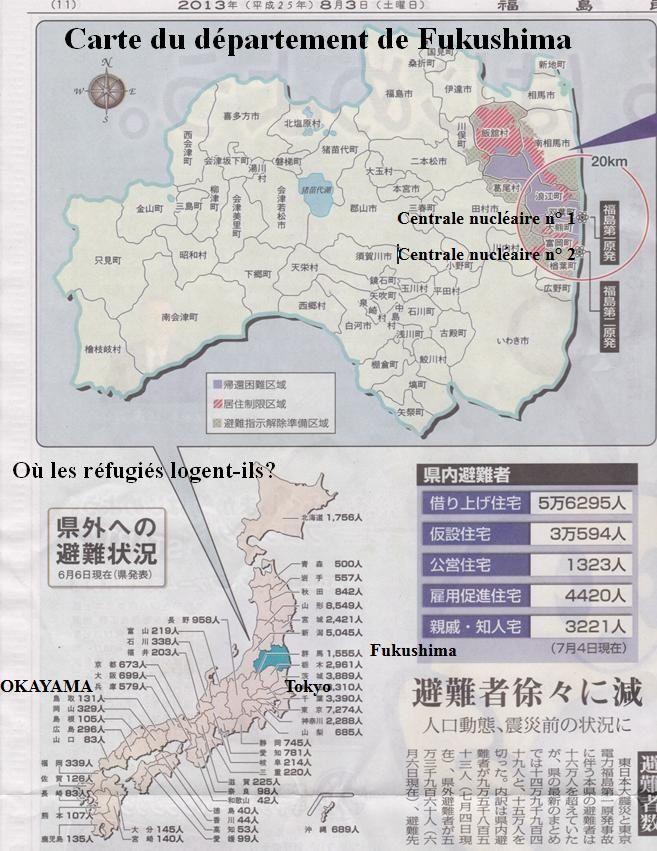Après l’accident nucléaire de Fukushima, non seulement des habitants de Fukushima, mais encore des personnes de départements voisins ont trouvé refuge dans d’autres départements. Le nombre de réfugiés en provenance de Fukushima est de 149 949 pour une population totale (qui était de) de 2,1 millions. Voir la carte ci-dessus. Parmi ceux-ci 95 853 vivent dans d’autres villes du Fukushima et 53 960 dans d’autres départements.