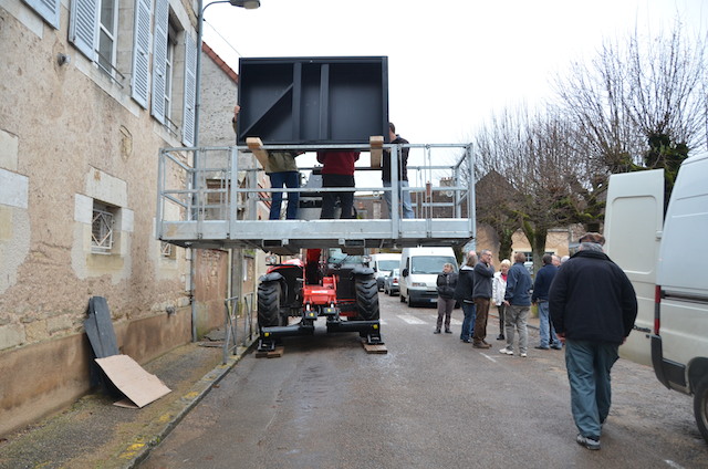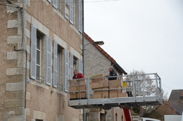 Aujourd’hui, jeudi 19 décembre, c’est le tour de la CCN et de la CCTP d’investir les lieux, en employant les grands moyens. C’est par les fenêtres que le mobilier et les dossiers en cours, investirons le second niveau de l’immeuble, avec l’aide d’un élévateur. Les cartons d’archives, quand à eux s’arrêterons au premier niveau.