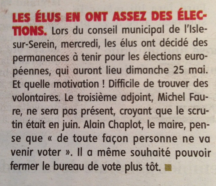 Comme le souligne ces quelques lignes parues dans la presse locale du samedi 26 avril 2014, les élus de l’Isle sur Serein sont beaucoup mois motivés pour les élections européennes que pour leurs propres élections.
