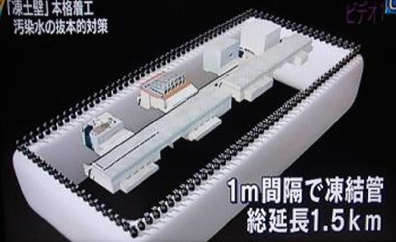 On prévoit de construire un mur de terre gelée de 1,5 km de long et 30 mètres de profondeur. Pour le construire, on a commencé d’abord par geler les jonctions des bâtiments des réacteurs avec les tunnels souterrains pour retirer l’eau polluée des tunnels, mais pour l’instant on n’a pas réussi. Beaucoup de gens doutent maintenant que l’on réussisse à construire un si grand mur de terre.