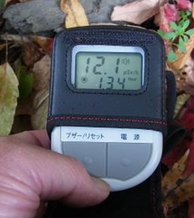 Entre le Musée et le mont Shinobu se trouve une rigole dans laquelle beaucoup de feuilles mortes étaient tombées. J’ai commencé à mesurer à cet endroit-là, mais le chiffre restait stable. Je me suis un peu déplacé vers le haut, j’ai remesuré et là, le chiffre augmentait de plus en plus, et le dosimètre a fini par indiquer 12,1 microsieverts/h. L’irradiation était là égale à cinquante-deux fois la norme ! C’était la première fois que ma main gauche était exposée à une aussi forte radioactivité.