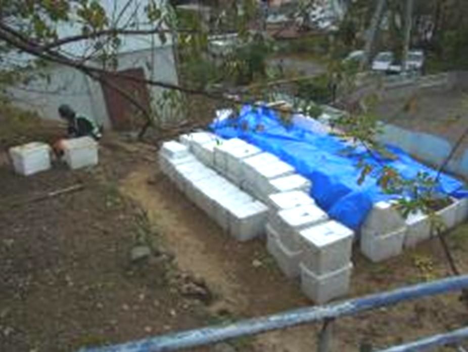 J’ai continué à rouler jusqu’à un endroit où s’élevaient plusieurs maisons. Quelques hommes travaillaient dans les jardins, raclant de la terre qu’ils mettaient dans des caisses blanches (voir photo ci-contre). Ils en avaient déjà rempli plus de cinquante. Ensuite ils ont répandu de la terre non polluée. Où donc mettraient-ils la terre polluée ?