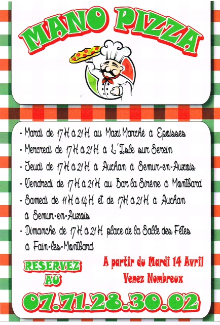 Après la pizza du mardi (Le Pizzaïolo) et celle du jeudi (Pizza Magic Busss), les aficionados de la pizza seront ravis de savoir qu’il y a désormais « Mano Pizza » le mercredi.