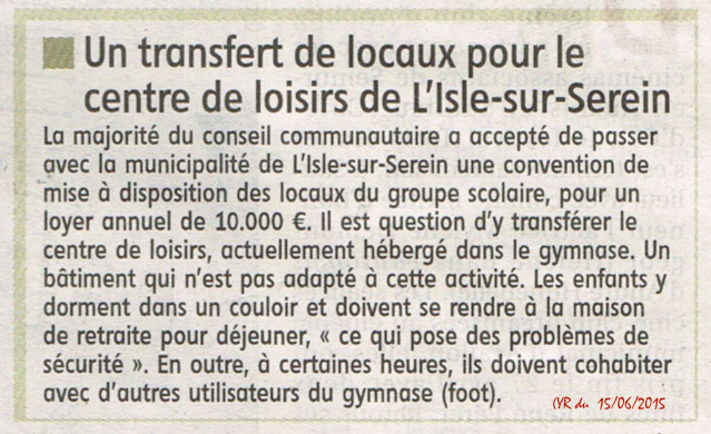 Les associations sportives de L’Isle, et des environs, serons ravies d’apprendre le départ du centre de loisirs vers d’autres locaux afin de pouvoir bénéficier au mieux du gymnase, pour leurs activités respectives et autres stages d’été.
