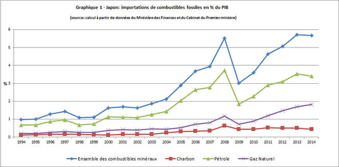 En 2013, pour la première fois en trois décennies, la balance commerciale japonaise a été déficitaire de 11,5 milliards de yens, dont 7 milliards attribués à l’implantation des industries japonaises dans d’autres régions d’Asie – ce qui est sans lien avec la catastrophe de Fukushima – et 4 milliards attribués au surcoût des importations de pétrole et de gaz permettant de produire une énergie qui n’était plus fournie par les centrales nucléaires. Toutefois, dès avril 2015, la balance commerciale était redevenue excédentaire, les achats de pétrole ayant chuté de 51 %, ceux de produits pétroliers de 38 %, et ceux de gaz naturel liquéfié de 12 %. Les mois qui ont suivi ont été très légèrement négatifs, mais sans commune mesure avec les deux années précédentes, la politique d’affaiblissement du yen menée par l’administration Abe depuis décembre 2012 ayant permis de revaloriser des exportations en forte hausse1.