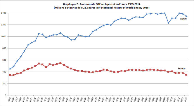 Emissions de CO2 au Japon et en France de 1965 à 2014.