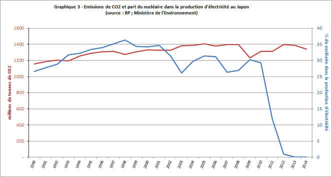 Sur la période récente, en dépit d’une hausse significative du recours à l’énergie d’origine fossile, le montant total des émissions de CO2 après la catastrophe de Fukushima n’a pas augmenté dans les proportions escomptées par les experts… et les ardents thuriféraires du nucléaire : les économies d’énergie réalisées, qui ont permis de compenser 28 % de la chute de la production électronucléaire entre avril 2011 et mars 2014, et le recours accru aux énergies renouvelables sont les deux principaux facteurs qui expliquent cette évolution. Ainsi, la consommation de charbon et de pétrole, bien qu’en hausse après 2010, n’a pas atteint son niveau antérieur à la crise de 2008. Les émissions de CO2, dont 40 % sont liés à la production d’électricité, ont gardé une trajectoire identique avant et après la catastrophe de Fukushima et sont revenues, à partir de 2012, à leur niveau de la période 2002-2008, soit environ 1,4 milliard de tonnes de CO2. La catastrophe de Fukushima n’a donc pas précipité le Japon dans une soudaine et inexorable croissance de ses émissions de dioxyde de carbone, mais est venue conforter une tendance à la hausse, antérieure au désastre, datant de la période de « reprise » ayant suivi la crise de 2008.