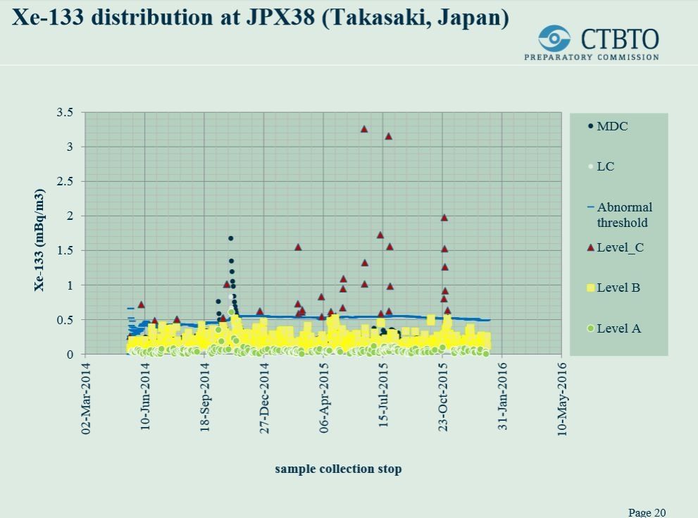 Comme il n’y a pas eu d’essai nucléaire atmosphérique en 2015, la présence de ce gaz dans des proportions anormales (dans le graphique « abnormal threshold ») résulte donc d’une réaction en chaîne « non ordinaire ». Pourquoi la CTBTO a-t-elle diffusé ce graphique de Takasaki pour les années 2014 et 2015 dans un rapport concernant la Corée du Nord ? Pour montrer que l’essai atomique  effectué début janvier 2016 n’a pas été détecté au Japon. Ça aurait été plus logique qu’ils diffusent un graphique d’une station qui l’aurait détecté, mais bon… En voulant rester discret sur les taux de Xénon détectés pour l’essai nord-coréen, ils ont dévoilé ce qui se passait au Japon. Ce qu’ils ont regretté quelques jours plus tard : le rapport où était publié ce graphique était disponible en ligne début janvier 2016 sur le site de la CTBTO.